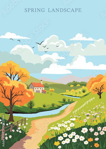 The watermark will not be included on Poster.: Spring landscape background with mountain and tree editable vector illustration for postcard,a4 vert