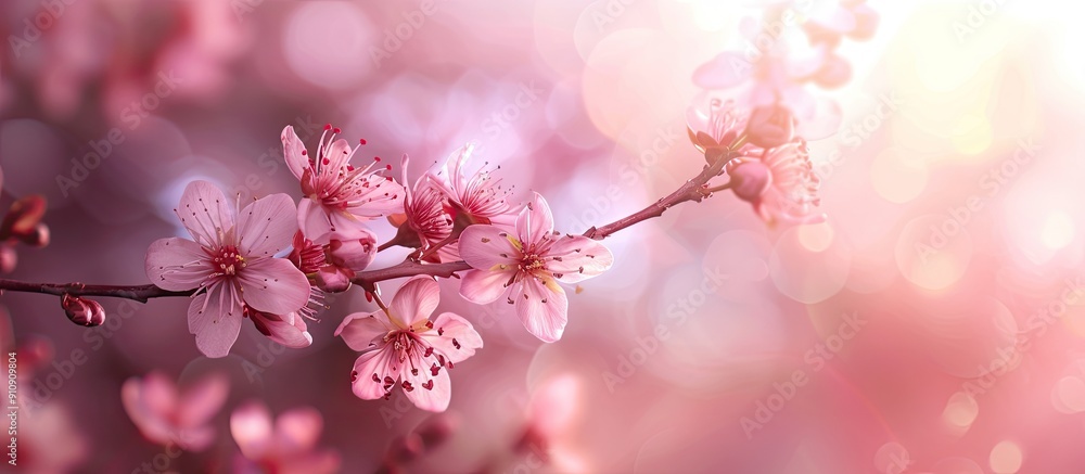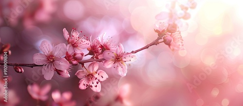 The watermark will not be included on Poster.: Spring themed template featuring a twig of pink sakura flowers on a blurred pink backdrop with selec