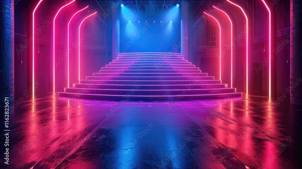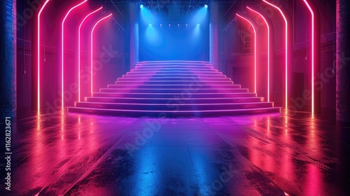 The watermark will not be included on Poster.: Stage with 3 led screens on a matting with many-curved borders with neon strips - black glossy floor,