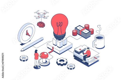 The watermark will not be included on Poster.: Startup concept in 3d isometric design - business team brainstorming and creating new company, attrac