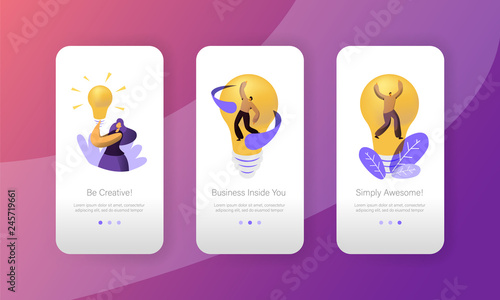 The watermark will not be included on Poster.: Startup creative idea lightbulb concept mobile app page onboard screen set - people work in project m