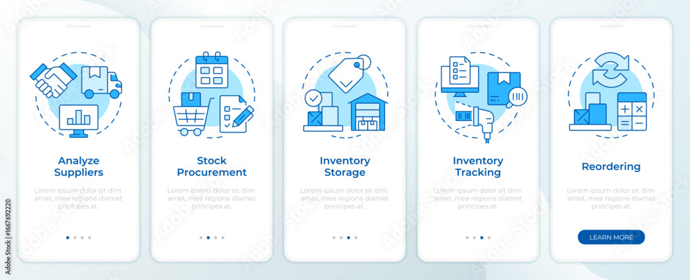 Poster : Steps of inventory management process blue onboarding mobile app screen - walkthrough 5 steps editabl