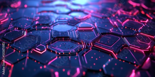 Poster : Stunning abstract image featuring a neon hexagonal pattern with glowing elements, vibrant colors, an