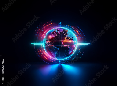 Poster stylized globe illuminated with neon lights. digital energy streams and particles orbit this vibrant