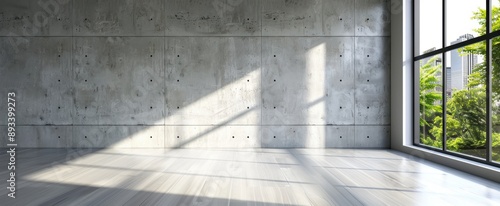 The watermark will not be included on Poster.: Sun shining through large windows in an empty room with concrete wall