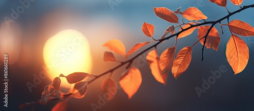 Poster sunset illuminating leaves on a nightly natural backdrop with copy space image.