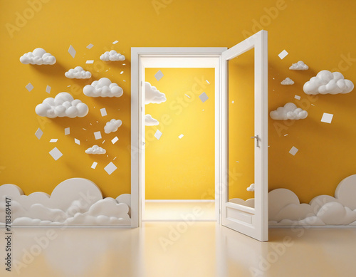 The watermark will not be included on Poster.: Surreal concept with flying white clouds passing through an open door on a bright yellow background -