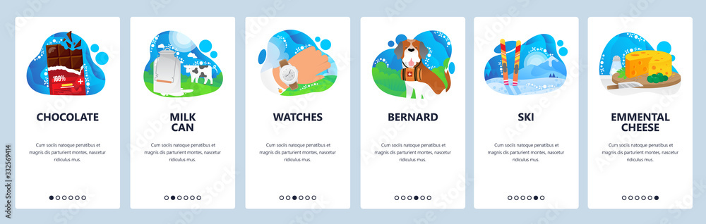 The watermark will not be included on Poster.: Switzerland website and mobile app onboarding screens vector template