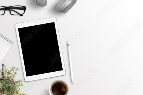 Poster : Tablet mockup on white desk with free space on right side for text - flat lay composition -
