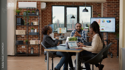 Poster team of business people working on financial analysis with data statistics in digital tablet and lap