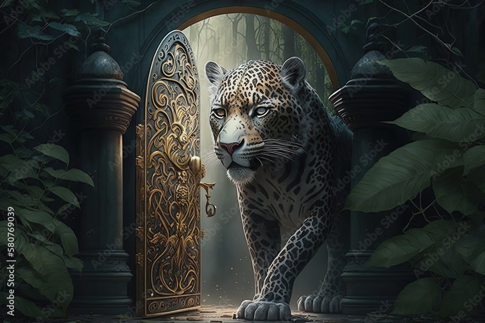 The watermark will not be included on Poster.: The guardian at the gate: an unforgettable encounter with a fantasy jaguar generative ai