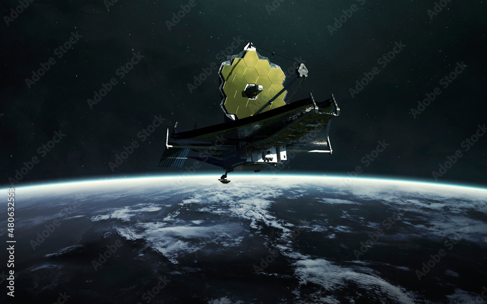 Poster the james webb telescope orbiting planet earth. jwst launch art. elements of image provided by nasa