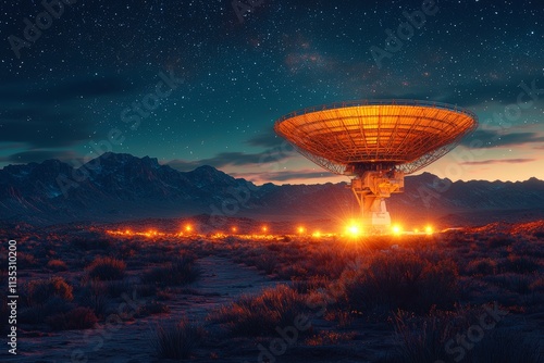 The watermark will not be included on Poster.: The space science antenna of an astronomical radio telescope rotates as it points towards the sky -