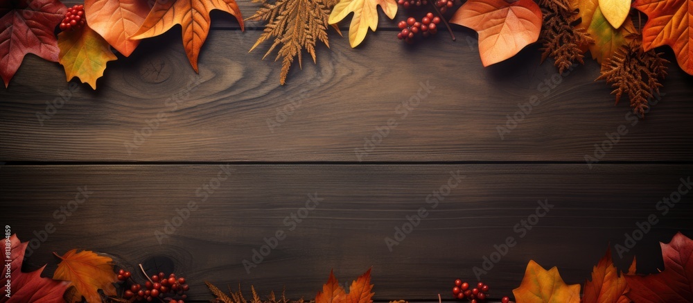 Poster there is a copy space image with autumn leaves forming a frame on a wooden background