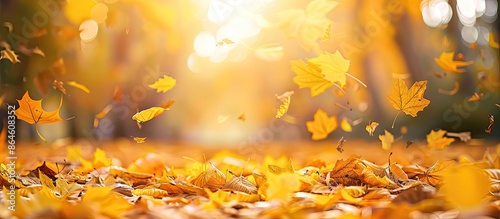 Poster there is an autumnal setting with yellow leaves fallen on the ground in the copy space image.