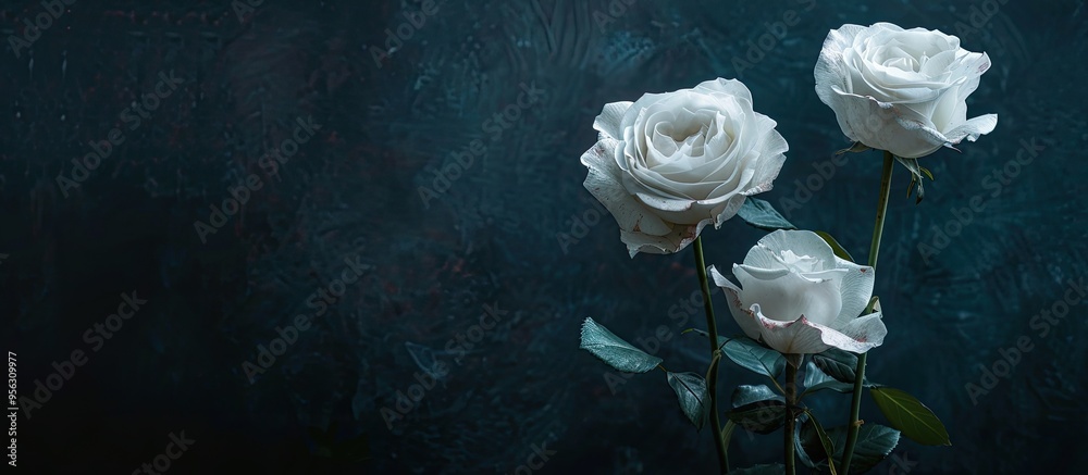 The watermark will not be included on Poster.: Three white roses displayed against a dark background with copy space image