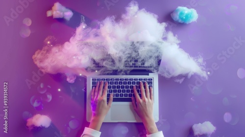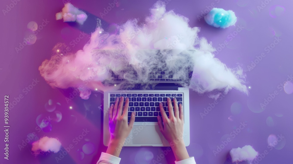 The watermark will not be included on Poster.: Top view of hands typing on laptop keyboard with futuristic cloud technology icons and digital data