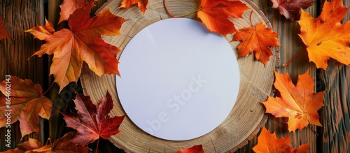 Poster top view on a wooden table displaying vibrant autumn leaves next to a blank round paper, perfect as