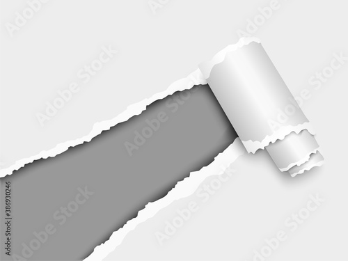 The watermark will not be included on Poster.: Torn, snatched window placed diagonally from lower left corner in white paper with paper curl - dark