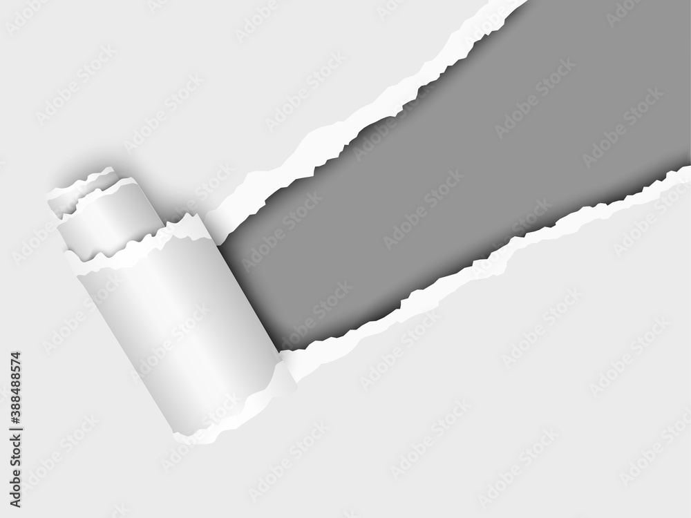 The watermark will not be included on Poster.: Torn, snatched window placed diagonally from upper right corner in white paper with paper curl - dark