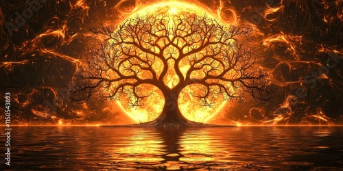 Poster tree is in the water with a large orange moon in the background - Posters Poster tree is in the water with a large orange moon in the background - Posters