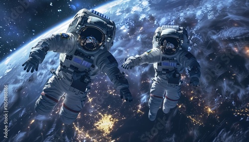 The watermark will not be included on Poster.: Two astronauts floating in space with earth and stars in the background