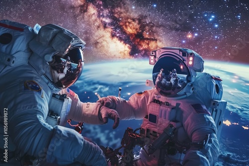 The watermark will not be included on Poster.: Two astronauts floating in space with earth and stars in the background