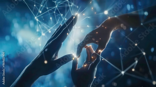 The watermark will not be included on Poster.: Two hands reach out towards each other, connected by a glowing web of lines and dots -