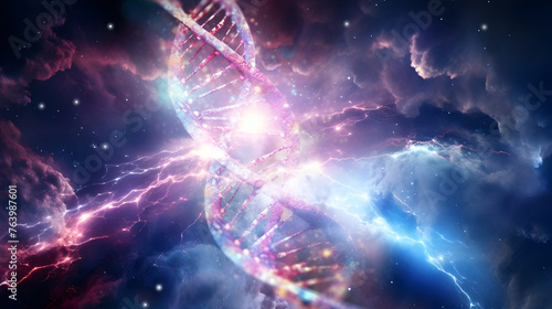 Poster vast deep space celestial background in pink and blue colors with a huge spiralling coil of dna merg