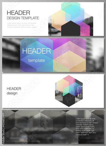 The watermark will not be included on Poster.: Vector layout of headers, banner design templates with colorful hexagons, geometric shapes, tech bac