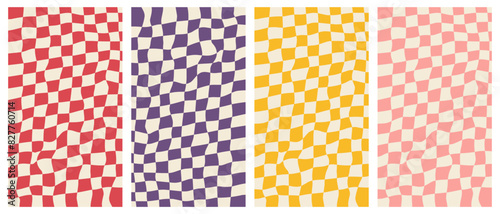 Poster vector set of groovy poster set. vertical checkerd backgrounds in trendy retro 70s style.