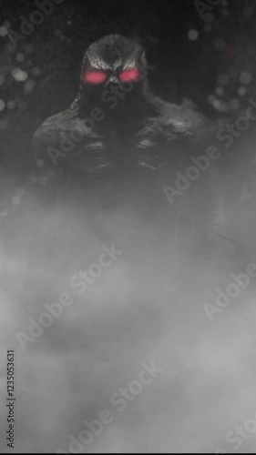 The watermark will not be included on Poster.: Vertical alien with glowing red eyes in fog 4k loop features a dark alien like creature with red eye