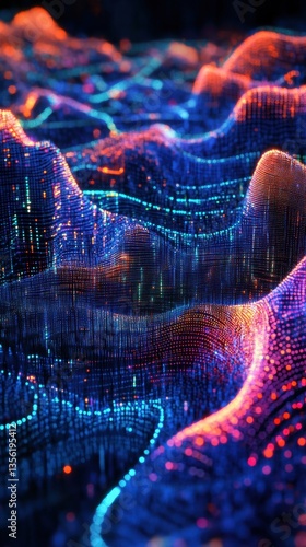 The watermark will not be included on Poster.: Vibrant abstract waves of light and color in a digital landscape representing data flow and connecti