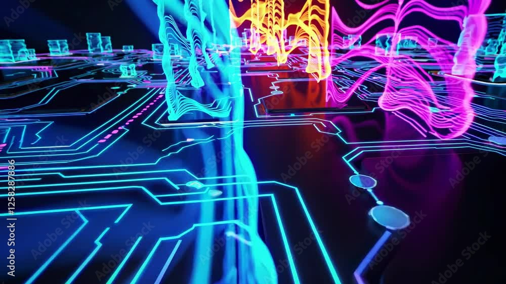 The watermark will not be included on Poster.: Vibrant digital landscape showcasing neon signals and circuit patterns in abstract design art