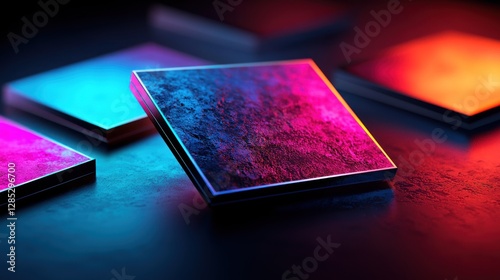 Poster vibrant geometric shapes with glowing edges on a dark surface, creating a modern artistic display