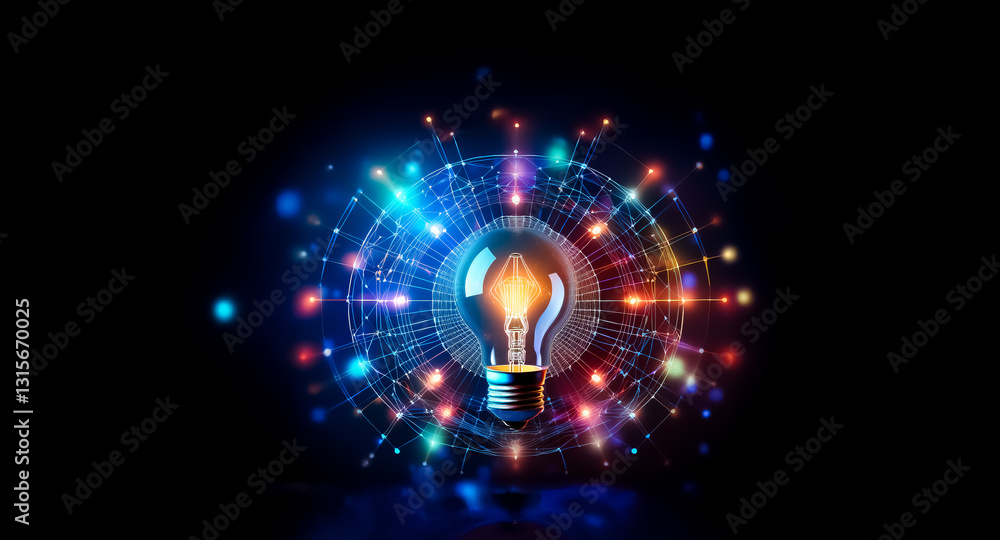 Poster : Vibrant light bulb illuminates from the center, surrounded by a dynamic web of colorful lights and c