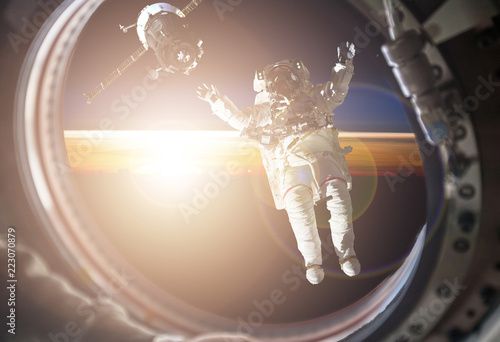 Poster view through the space ship illuminator of astronaut in open spacce with flare frome the star (image