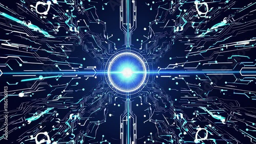 The watermark will not be included on Poster.: Visual representation of digital energy flowing through a central point in a futuristic landscape