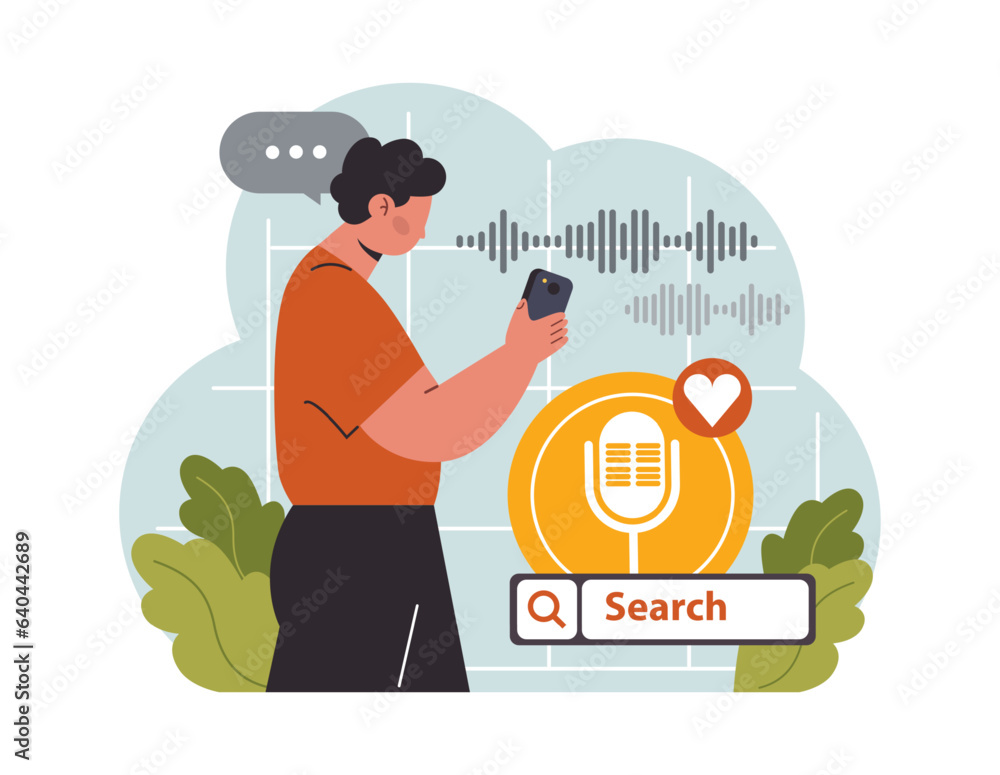 Poster voice search. artificial intelligence virtual assistant. man speaking on microphone