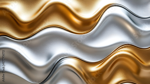 Poster : Wavy metallic patterns of gold and silver showcasing a fluid and dynamic design in a contemporary ab