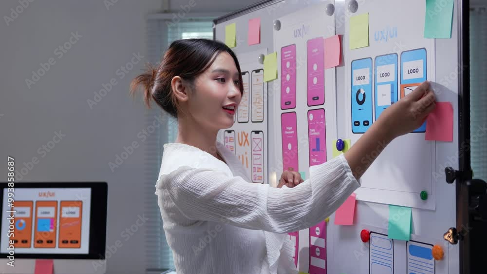 The watermark will not be included on Poster.: Web designer arranging colorful post it notes on a whiteboard for effective project planning and bra