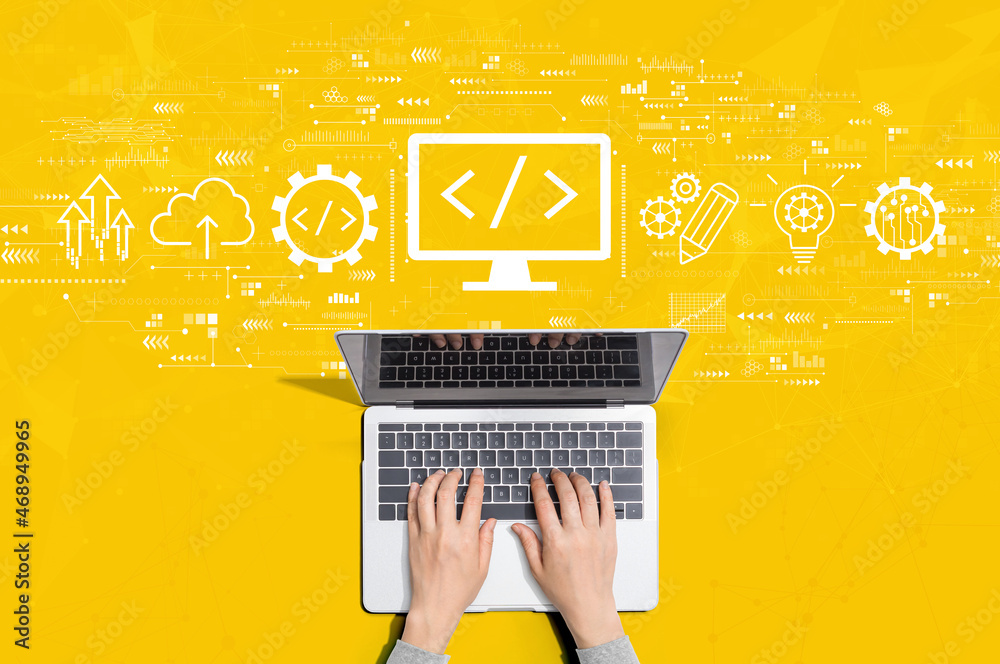 The watermark will not be included on Poster.: Web development concept with person using a laptop computer