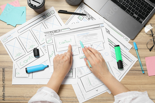 Website designer creating wireframe on paper with pen at wooden table, top viewPoster