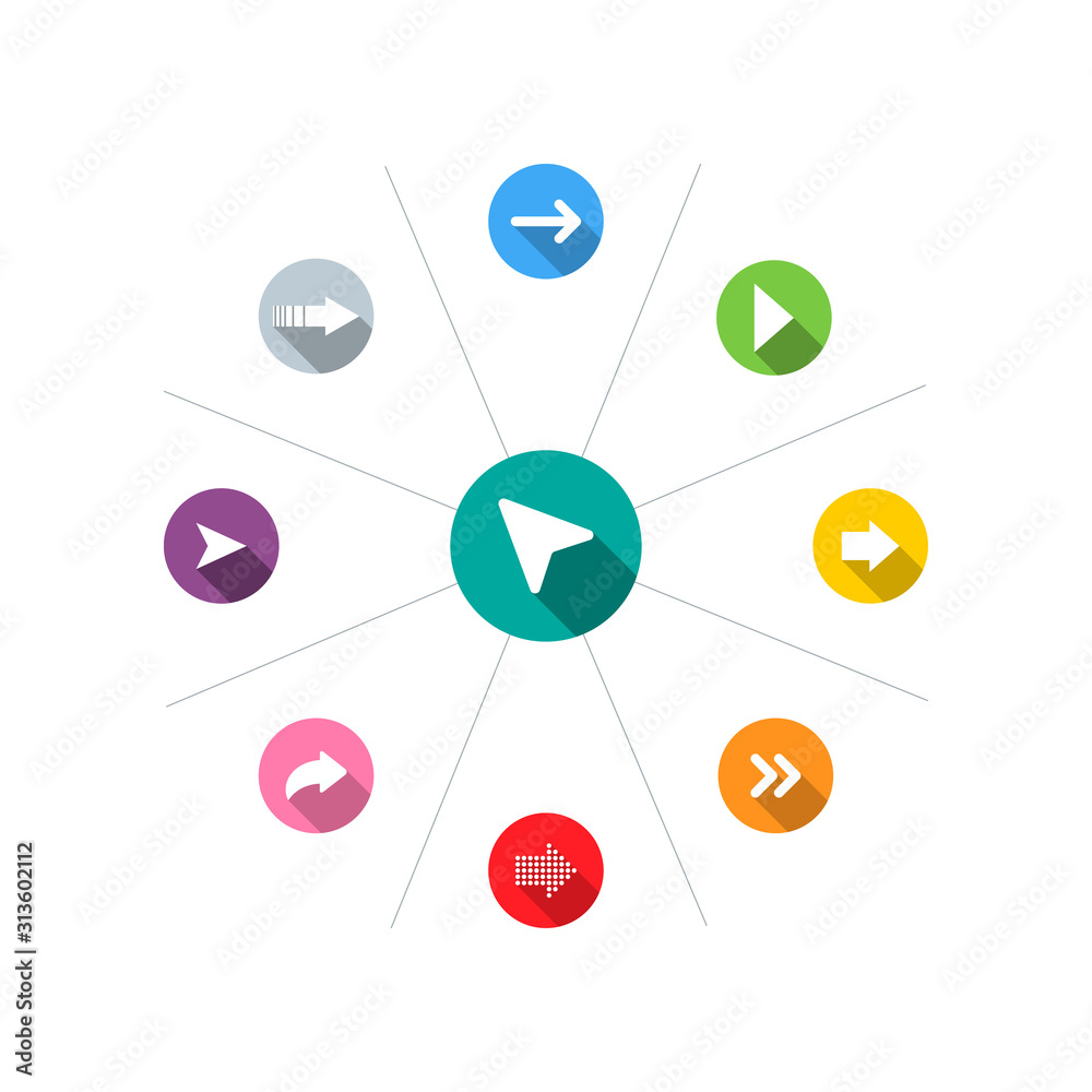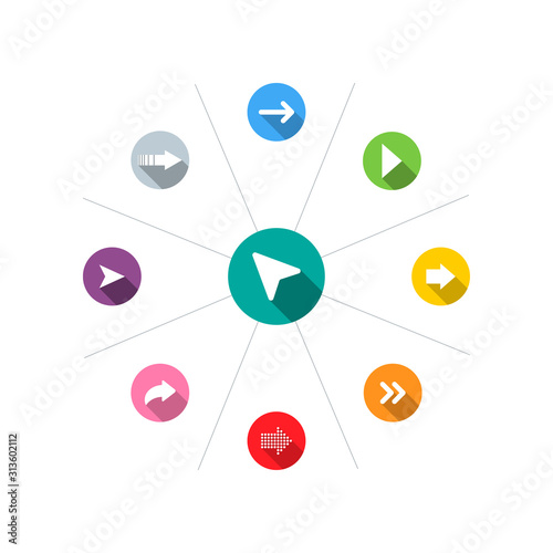 Poster : White arrows in colorful circles, isolated on white background - arrows with shadow in modern simple