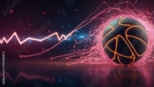 The watermark will not be included on Poster.: Wireframe basketball player dribbling a ball with glowing lines and pink particles in the background