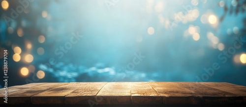 Poster wooden table surface with blurred blue bokeh lights in background and copy space.