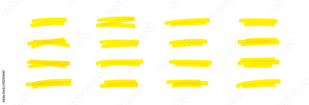 Poster yellow marker strokes set with brush texture for highlighting text. doodle underline or box elements
