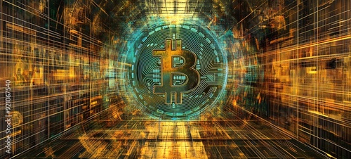 The watermark will not be included on Sticker.: 27 - an abstract representation of bitcoin embedded in a sophisticated digital grid