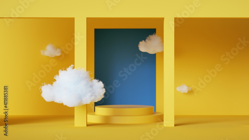 The watermark will not be included on Sticker.: 3d render, abstract background with levitating clouds inside the yellow room with blue window - simpl