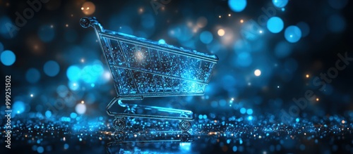 The watermark will not be included on Sticker.: 3d rendering of a blue shopping cart made of digital code on a dark background with blue bokeh light